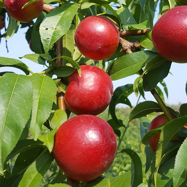 晚四号油桃:果实发育期80天,果实短椭圆形,单果重200克,果皮底色黄,全面着鲜红色,套袋金黄色,果肉黄色,风味浓甜,粘核。该品种树势强,座果率极高,适合大棚种植。